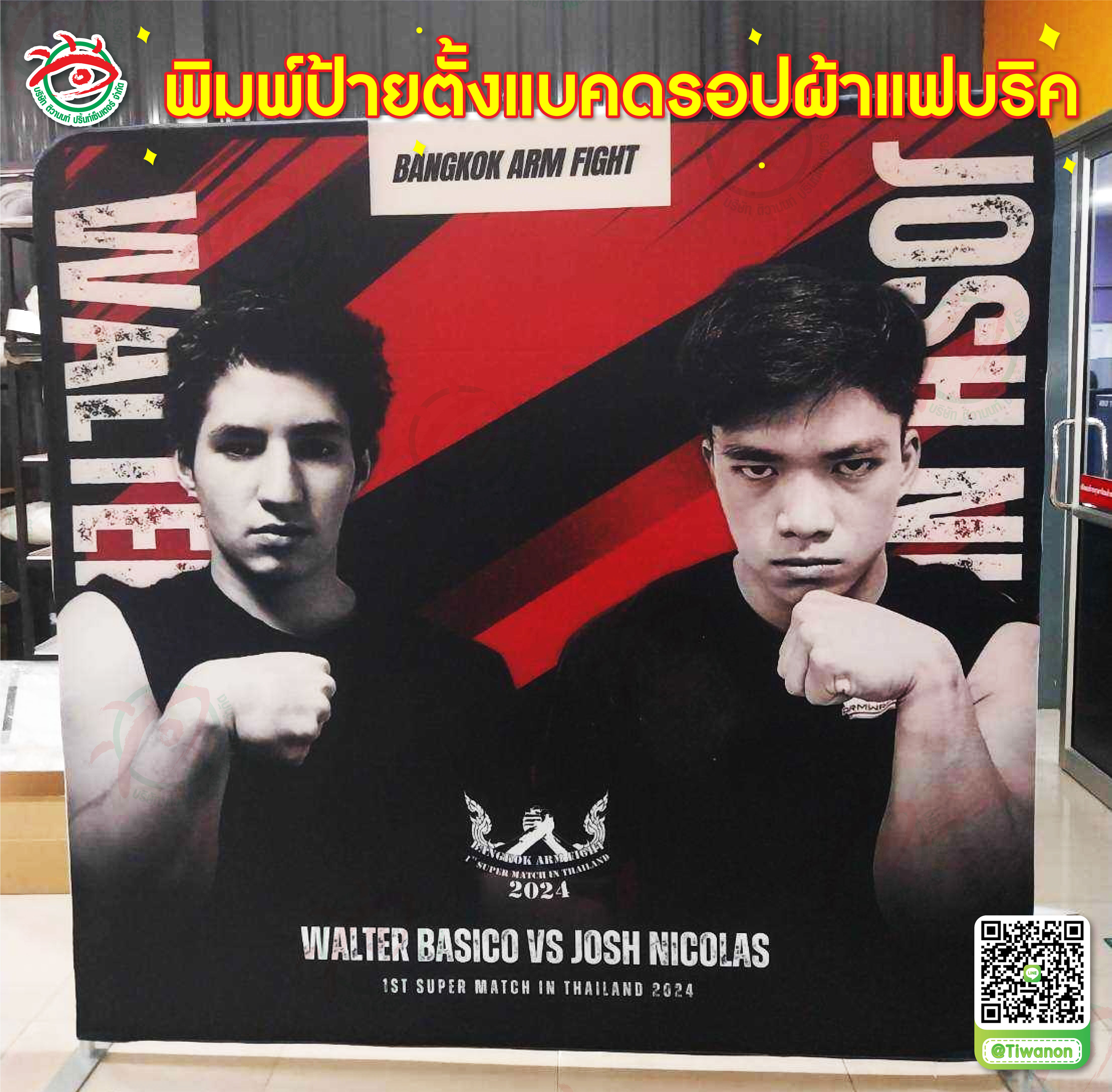 🥇 ป้ายแบคดรอปผ้าแฟบริค ออกงานแมทช์แขนเหล็ก "WALTER BASICO VS JOSH NICOLAS" | ผลิตโดยร้านป้ายติวานนท์