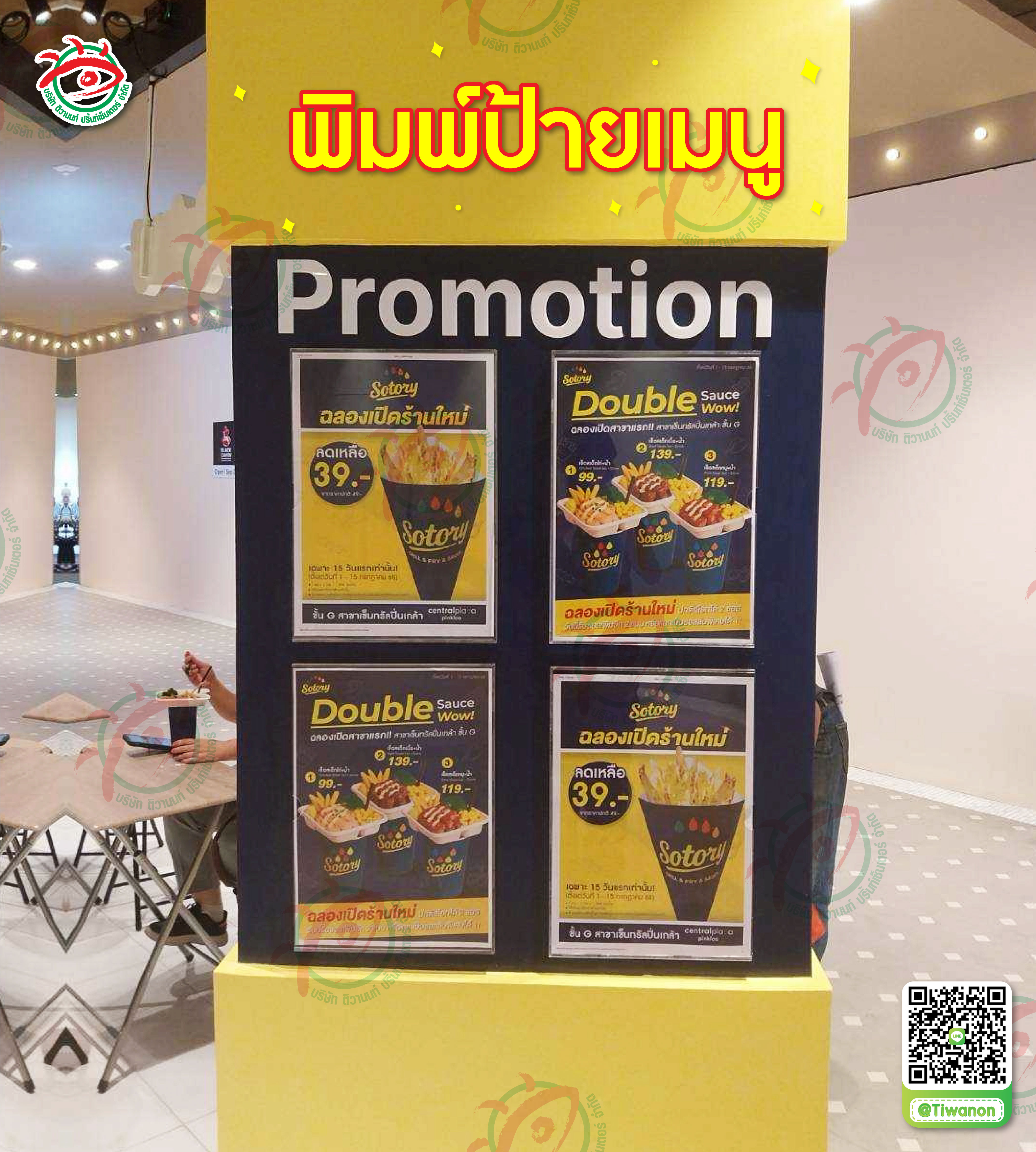 ประเภทของป้ายโฆษณาโปรโมชั่น ป้ายเมนูโปรโมชั่นพิเศษ สำหรับติดตั้งในพื้นที่หน้าร้าน ลักษณะของป้ายโปรโมชั่นที่ปรากฏในภาพ ป้ายในภาพเป็น ป้ายโฆษณาประเภทพิมพ์สื่อประชาสัมพันธ์ Promotional Poster ติดตั้งอยู่บนผนังเสาสีเหลือง พร้อมหัวข้อเด่นว่า “Promotion” ด้วยตัวอักษรภาษาอังกฤษสีขาว ตัวใหญ่ คมชัด ด้านบนสุดของชุดป้าย เพื่อดึงดูดสายตาลูกค้าที่เดินผ่านไปมาในศูนย์การค้า