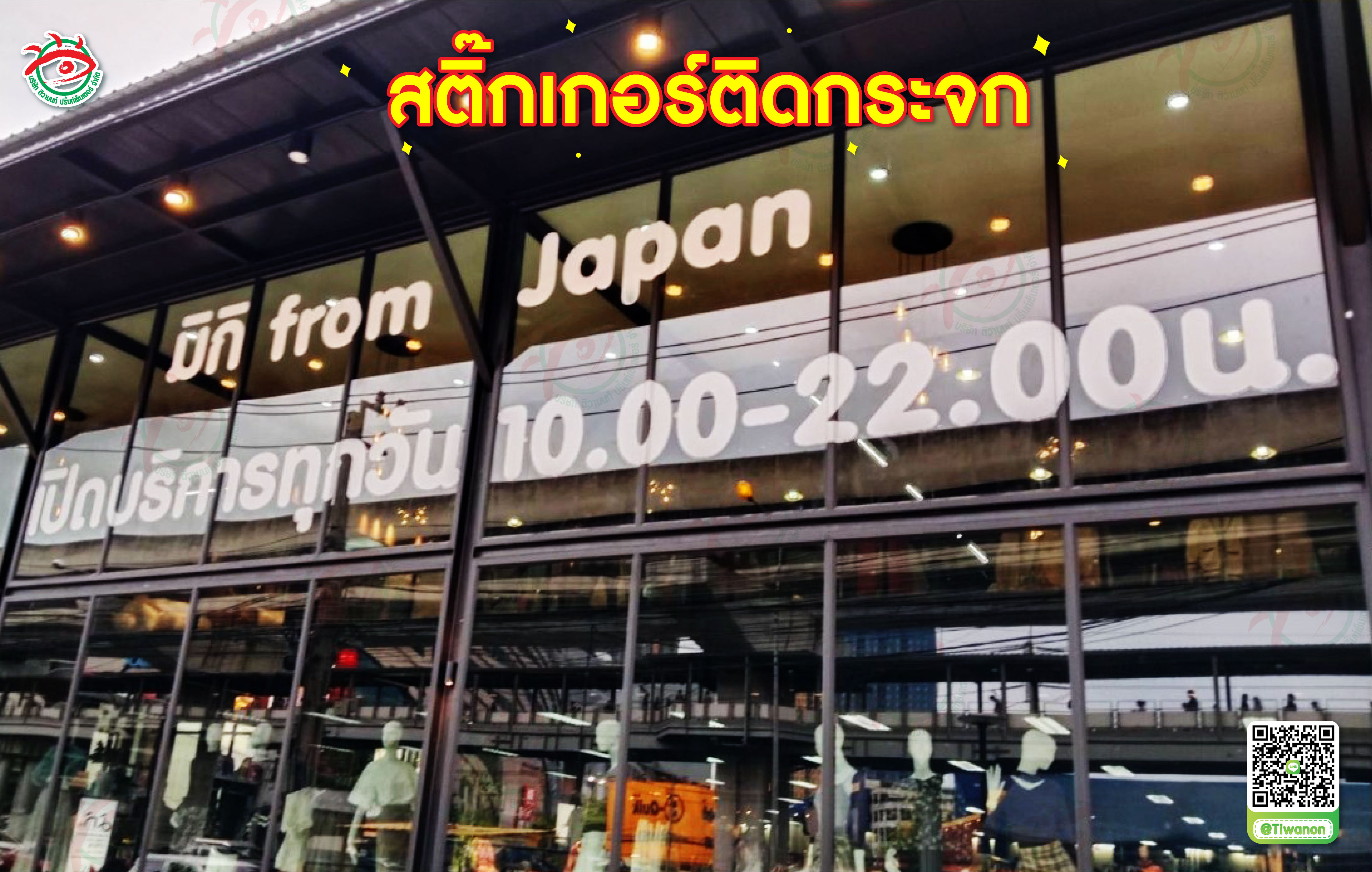 ตกแต่งหน้าร้าน ,แจ้งเวลาเปิด-ปิดร้าน ,สร้างภาพจำของแบรนด์ ,เพิ่มความน่าสนใจให้กับหน้าร้านและโชว์รูม ข้อดีของการใช้สติ๊กเกอร์ไดคัทติดกระจก ไม่มีพื้นหลัง Background Transparent ตัวอักษรลอยอยู่บนกระจก ทำให้ดูสะอาดตา ทันสมัย สร้างความน่าเชื่อถือให้แบรนด์ ลูกค้าที่เห็นข้อความ "from Japan" จะเข้าใจได้ทันทีว่าสินค้ามีต้นกำเนิดจากญี่ปุ่น เพิ่มความน่าเชื่อถือ ติดตั้งง่าย ถอดออกไม่ทิ้งคราบกาว หากเปลี่ยนข้อความหรือโปรโมชั่นสามารถลอกออกได้โดยไม่ทำลายกระจก สามารถติดได้ทุกวัสดุ เช่น กระจก อะคริลิก พลาสติก หรือผนังเรียบ ตัวอย่างการใช้งานจริง ร้านค้าในห้างสรรพสินค้าและโชว์รูม เช่น ร้าน "มิกิ from Japan" ในภาพ นิยมใช้สติ๊กเกอร์ไดคัทเพื่อตกแต่งกระจกหน้าร้าน พร้อมแจ้งเวลาให้ลูกค้าทราบ