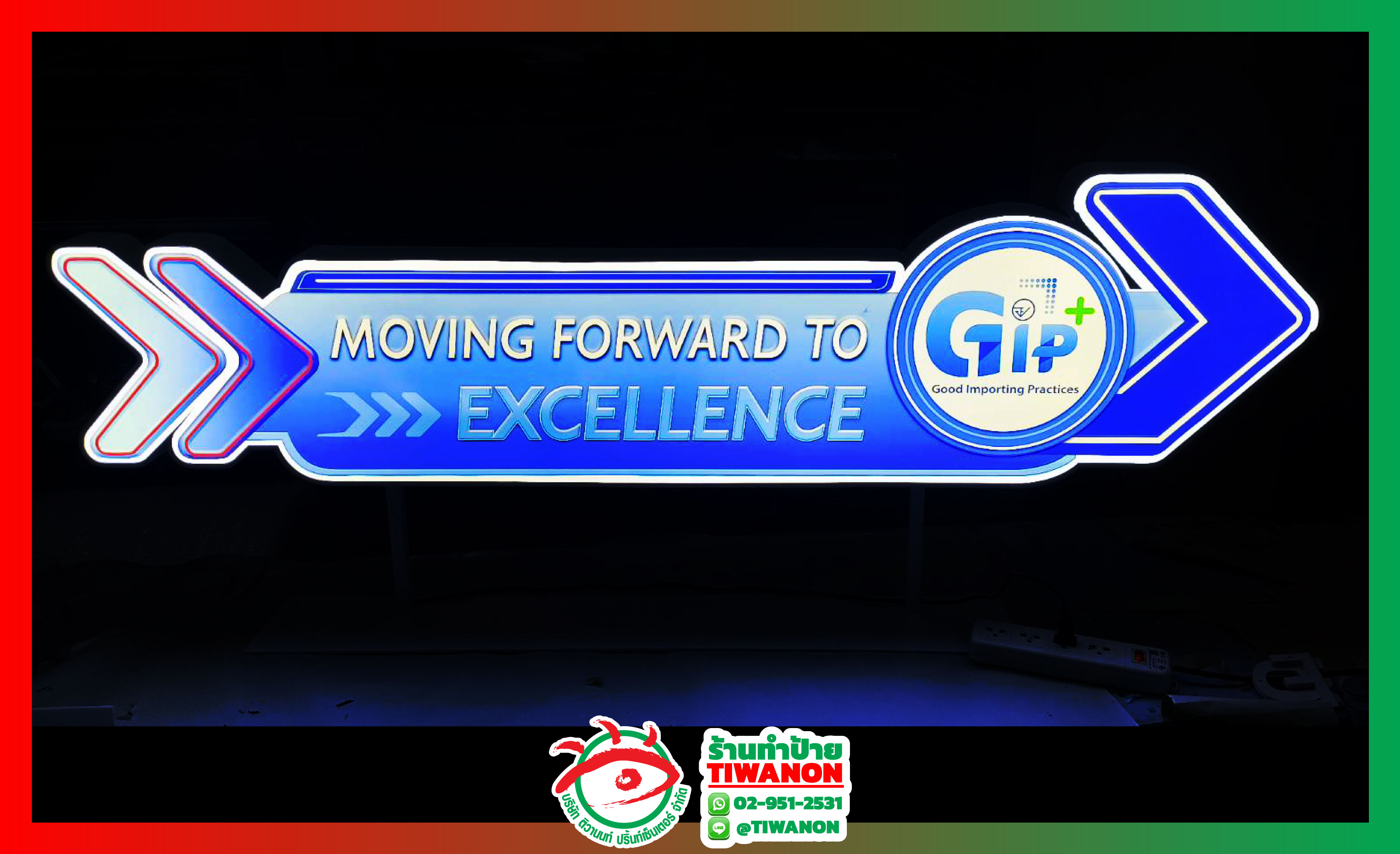 ป้ายในภาพนี้เป็นหนึ่งในผลงานคุณภาพที่ร้านป้ายติวานนท์ผลิตขึ้นมา โดยเป็น ตู้ไฟซิงค์ไดคัต ออกแบบเป็นรูปทรงลูกศรสีน้ำเงินและขาว มีไฟส่องสว่างสวยงามตลอดทั้งป้าย ตัวอักษรหลักคือ “MOVING FORWARD TO EXCELLENCE” และโลโก้ “GIP+ (Good Importing Practices)” อยู่ด้านขวาของป้าย ทำให้ป้ายดูโดดเด่น สะดุดตา เหมาะกับการใช้เป็นป้ายบอกตำแหน่ง ป้ายประชาสัมพันธ์ หรือป้ายตกแต่งองค์กร/ร้านค้า
