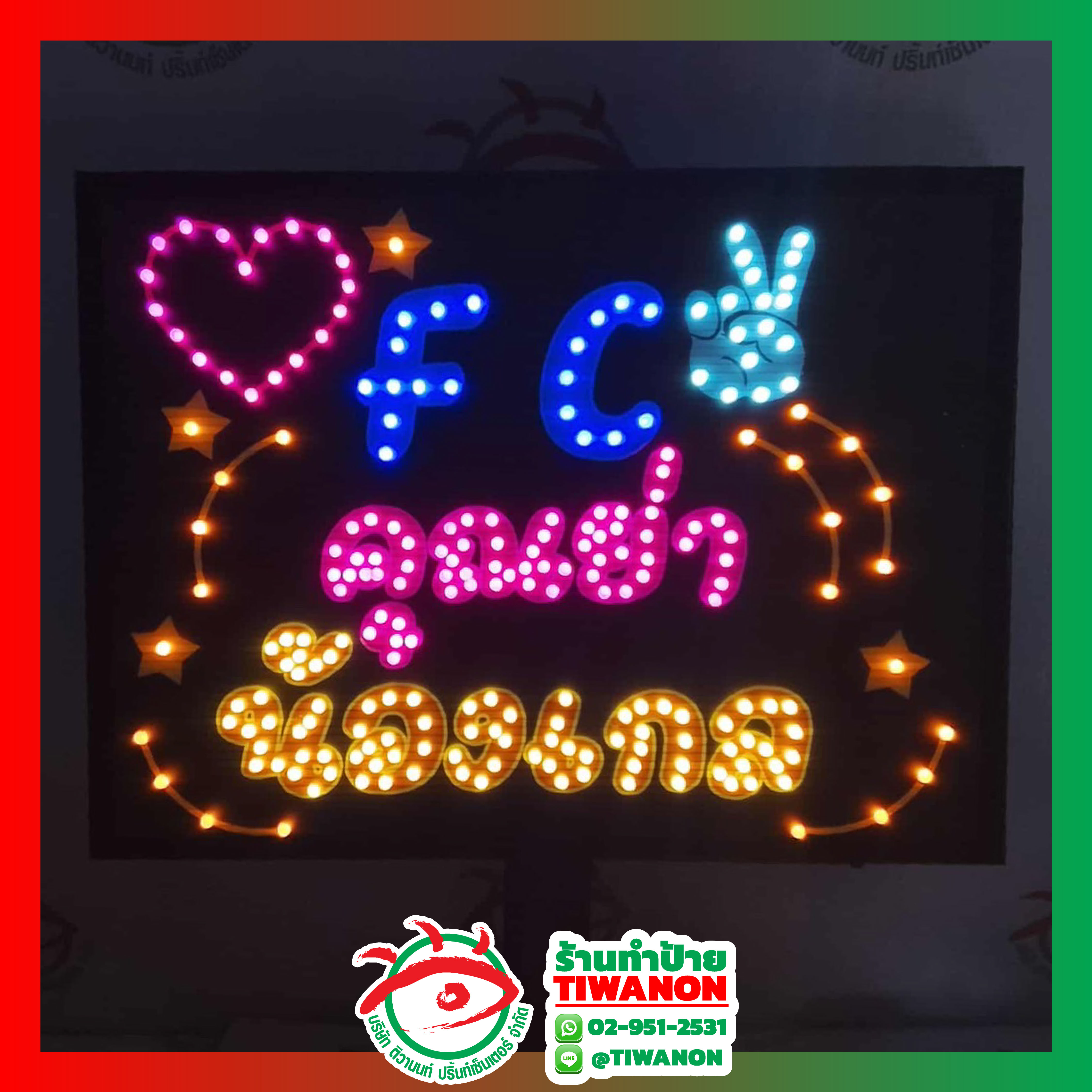 ดึงดูดลูกค้าให้มาทำป้ายกับเรา ถ้าคุณกำลังมองหาป้ายไฟเชียร์ที่ โดดเด่น ไม่เหมือนใคร และสื่อความรู้สึกได้ชัดเจน ร้านป้ายติวานนท์คือตัวเลือกที่เหมาะสมที่สุด เรามีบริการออกแบบและผลิตป้ายไฟเชียร์ที่สามารถ ใส่ชื่อคนที่คุณรักหรือศิลปินที่คุณชื่นชอบ ได้อย่างตรงใจ ไม่ว่าจะเป็น ป้ายข้อความสั้นๆ บอกรัก ป้าย FC ป้ายชื่อเล่น หรือป้ายที่มีดีไซน์พิเศษ เราสามารถทำให้คุณได้อย่างครบวงจร ด้วยราคาที่เหมาะสม และคุณภาพที่มั่นใจได้