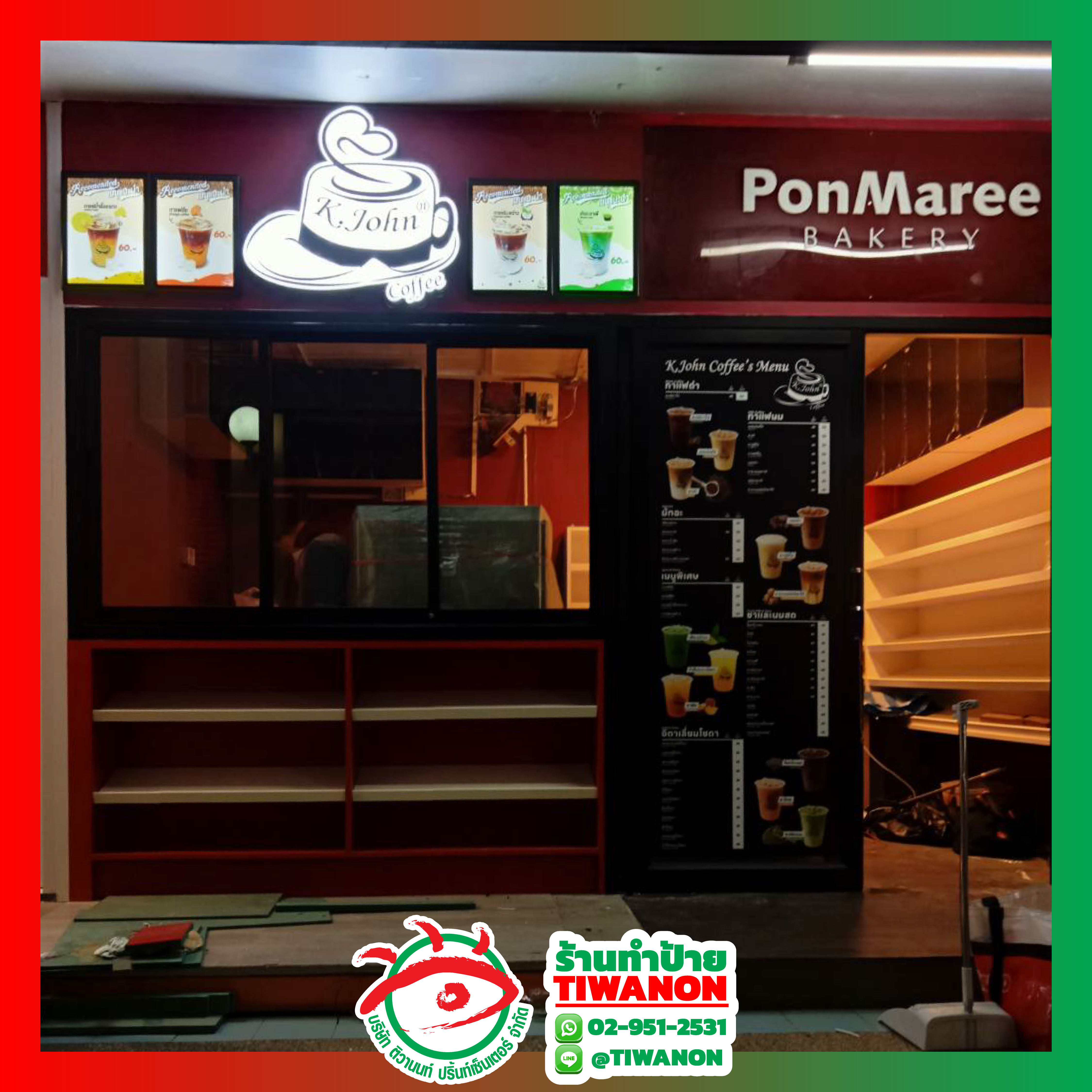 ป้ายบอกตำแหน่งร้าน แผงชื่อ “PonMaree BAKERY” โลโก้ซิงค์ออกไฟไดคัท โลโก้ “K.John Coffee” สว่างเด่น ป้ายกรอบไฟกระจายแสง รุ่นสลิมไลน์บล๊อก ภาพเมนูเด่นเหนือช่องเสิร์ฟ ป้ายเมนู กระดานเมนูหลักด้านข้าง แสดงรายการและราคา ขนาด/สเปกโดยประมาณ สามารถปรับตามพื้นที่จริง โลโก้ออกไฟสูง 50–70 ซม. ความลึก 8–10 ซม. กรอบไฟสลิมไลน์บล๊อก A3/A2 ปรับได้ ความหนาประมาณ 2–3 ซม.