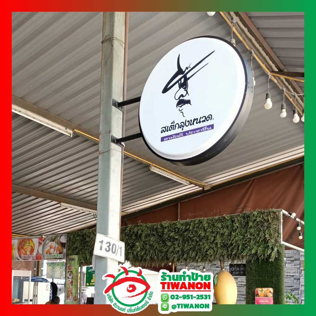 ตู้ไฟบอกตำแหน่งร้านแบบขายื่นสองหน้า ป้าย “สเต๊กลุงหนวด” จัดอยู่ในหมวด ตู้ไฟบอกตำแหน่งร้าน (Double-Sided Round Lightbox Sign) ซึ่งออกแบบให้มองเห็นได้จากทั้งสองด้าน เหมาะสำหรับร้านอาหาร ร้านกาแฟ ร้านตัดผม หรือร้านบริการทั่วไปที่ต้องการดึงดูดลูกค้าให้หันมามองร้าน จุดเด่นของป้ายประเภทนี้คือสามารถ เปิดไฟในเวลากลางคืน เพื่อสร้างความสว่างและความโดดเด่นให้ร้าน พร้อมทั้งช่วยเป็นจุดนำสายตาได้อย่างดีเยี่ยม เมื่อไฟ LED ส่องผ่านแผ่นอะคริลิก จะให้แสงนวลตา มองเห็นชัดทั้งกลางวันและกลางคืน