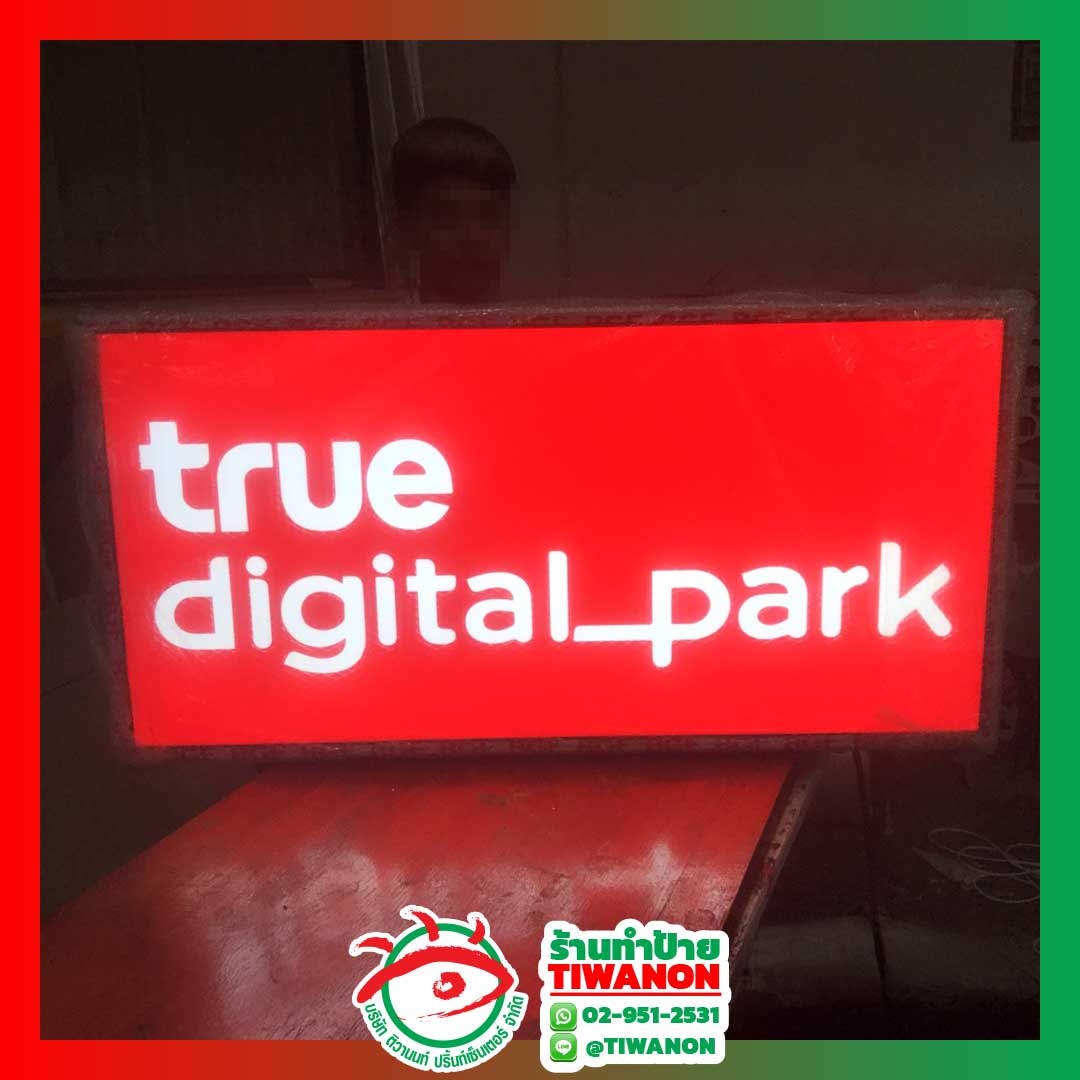 ออกแบบเบื้องต้น Design ทีมกราฟิกของร้านป้ายติวานนท์จัดทำแบบตามโลโก้องค์กรจริง เพื่อคงอัตลักษณ์ของแบรนด์ “true digital park” ผลิตโครงตู้ ช่างเชื่อมประกอบโครงซิงค์ตามขนาดที่กำหนด เคลือบกันสนิมด้วยสีกันน้ำ ฉลุตัวอักษร ใช้เครื่อง CNC ตัดตัวอักษรลงบนแผ่นหน้า ด้วยความละเอียดระดับมิลลิเมตร ติดตั้งแผ่นอะคริลิกและไฟ LED ติดตั้งหลอด LED ภายในตู้พร้อมเดินสายไฟอย่างปลอดภัย ทดสอบความสว่าง ตรวจสอบการกระจายของแสงและความสมดุลก่อนส่งมอบ ติดตั้งหน้างาน ทีมงานช่างของติวานนท์ปริ้นท์ดำเนินการติดตั้งหน้างานอย่างมืออาชีพ พร้อมเก็บรายละเอียดให้เรียบร้อย