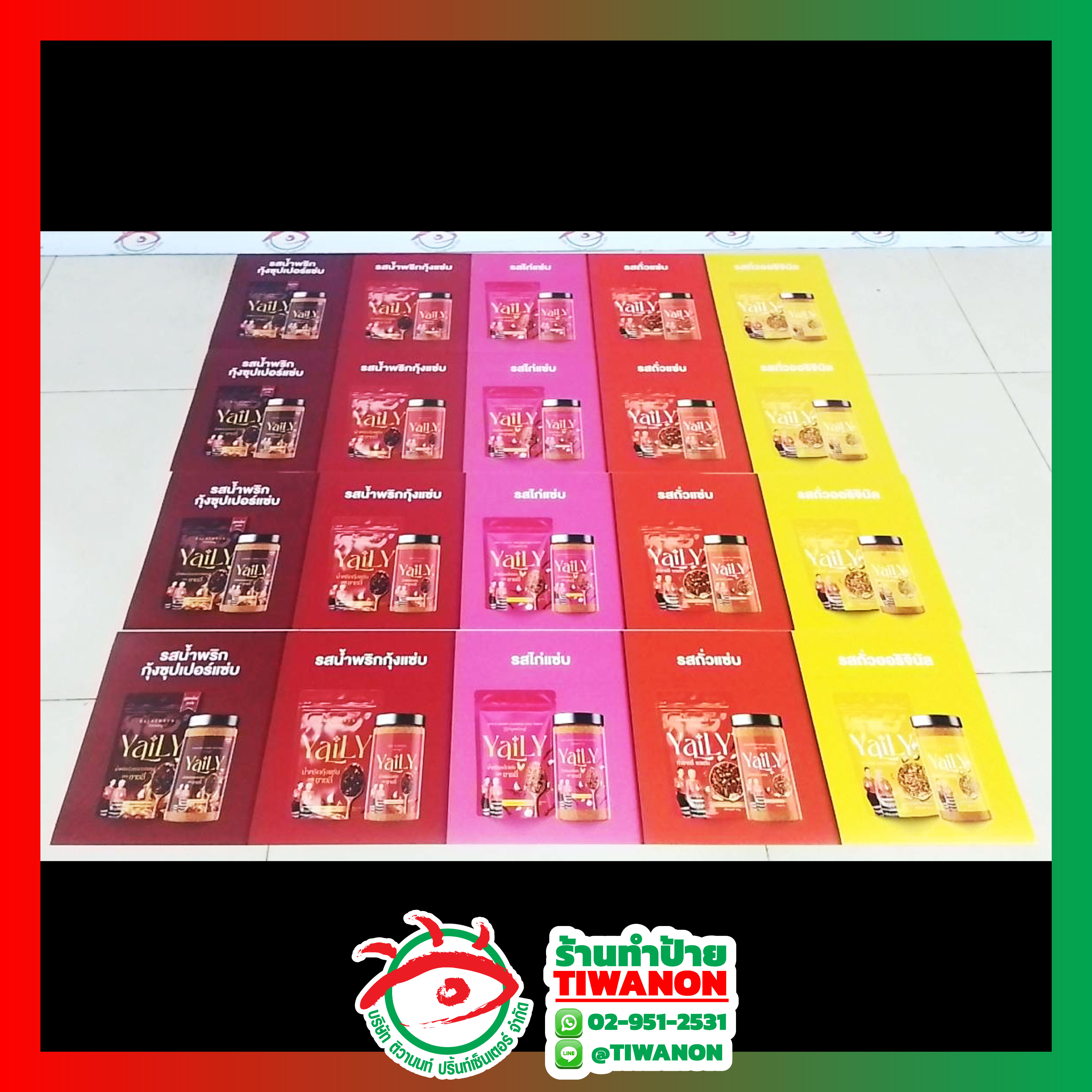 ป้ายในภาพเป็นชุดป้ายเมนูรายการสินค้าแบบพิมพ์แผ่นแบล็คลิสสำหรับใส่ในตู้ไฟ โปรโมทสินค้าขนมขบเคี้ยวภายใต้แบรนด์ “YaiLY” ซึ่งผลิตและพิมพ์โดย ร้านป้ายติวานนท์ ทั้งชุดจัดวางอยู่บนพื้นเป็นกริด 4 แถว 5 คอลัมน์ รวมทั้งหมด 20 แผ่น แต่ละแผ่นออกแบบให้สื่อรสชาติที่แตกต่างกันผ่าน “สีพื้น” และ “ภาพสินค้า” อย่างชัดเจน ทำให้เมื่อถูกนำไปใส่ในกรอบไฟหรือเมนูตู้ไฟในร้าน จะโดดเด่น สะดุดตาลูกค้าตั้งแต่ระยะไกล