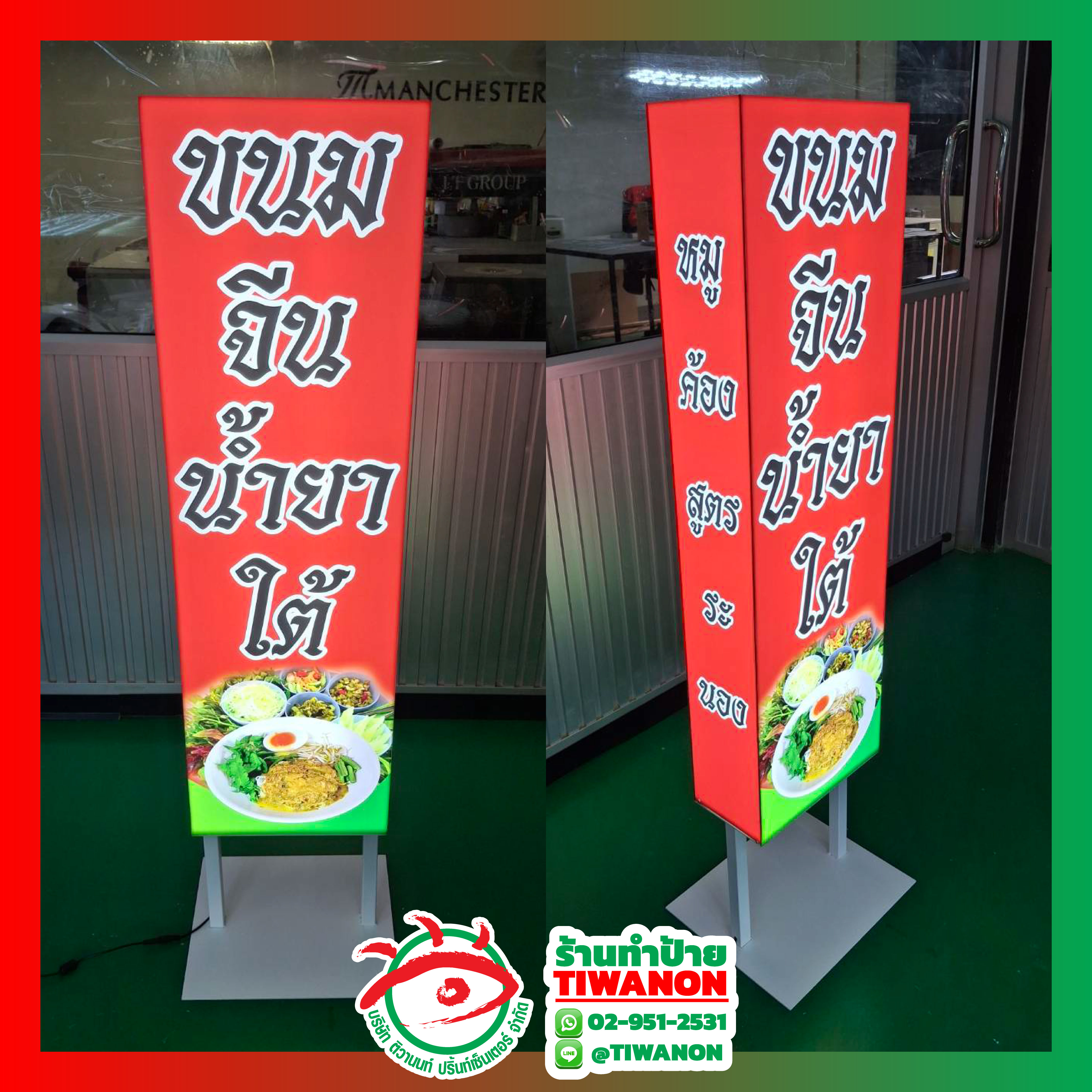 ป้ายตั้งกล่องไฟอะคริลิก 4 ด้าน “ขนมจีนน้ำยาใต้” ที่ผลิตโดย ร้านทำป้ายติวานนท์ เป็นหนึ่งในงานป้ายที่ออกแบบมาเพื่อให้ ร้านอาหารหรือร้านจำหน่ายสินค้า มีความโดดเด่นและจดจำง่าย ตัวป้ายออกแบบในทรง สี่เหลี่ยมตั้งพื้น มีความสูงพอดีระดับสายตา และแสงไฟภายในกระจายอย่างทั่วถึงทุกด้าน ทำให้มองเห็นข้อความชัดเจนทั้งกลางวันและกลางคืน