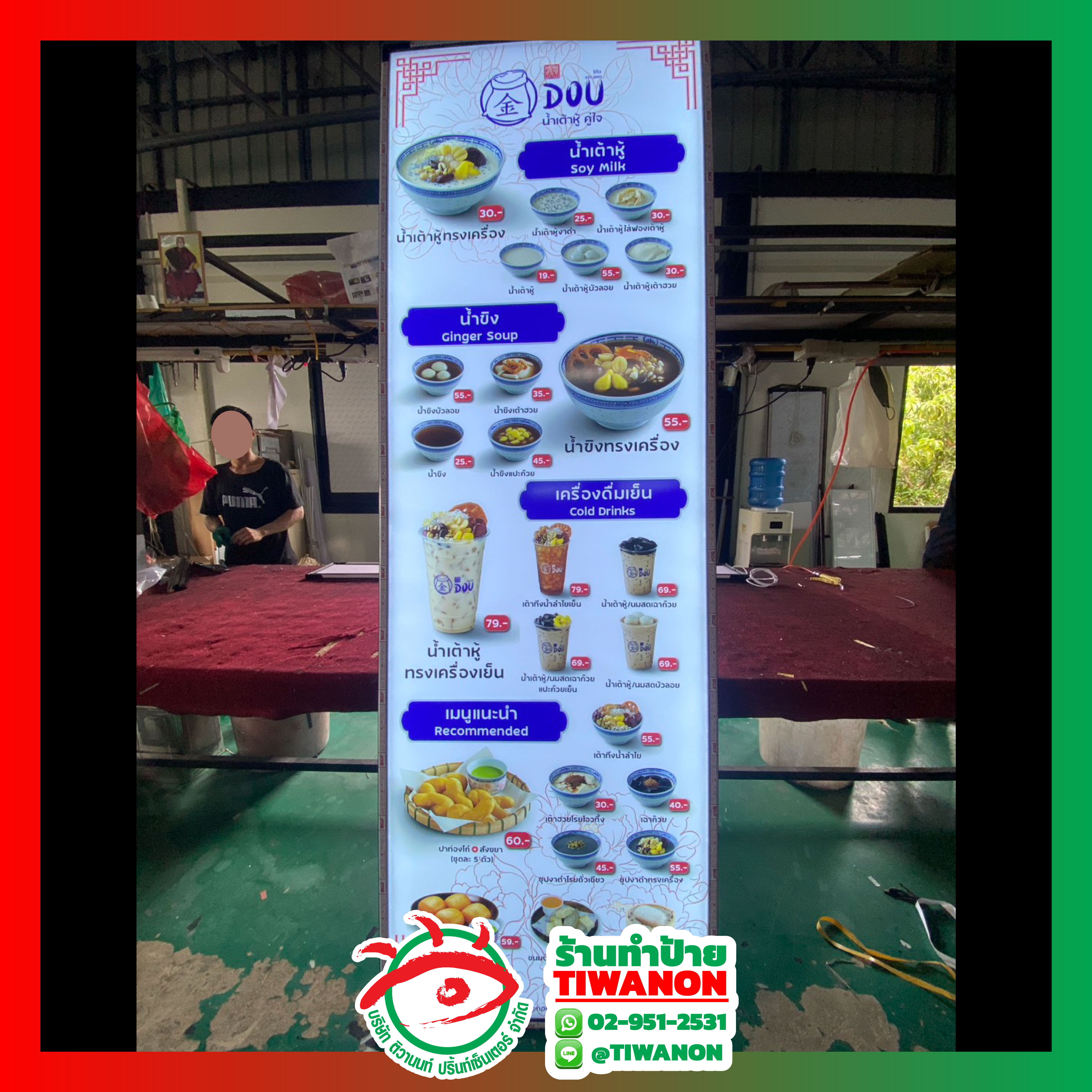 การใช้กรอบป้ายไฟอลูมิเนียมแบบสูงตั้งพื้น ช่วยให้เมนูของร้านโดดเด่นในพื้นที่ที่มีร้านเยอะ ๆ ลูกค้าเดินผ่านก็เห็นไฟป้ายก่อน เห็นภาพน้ำเต้าหู้ทรงเครื่องร้อน ๆ และแก้วน้ำเต้าหู้เย็นเต็มเครื่องแล้วอยากหยุดดูและสั่งทันที