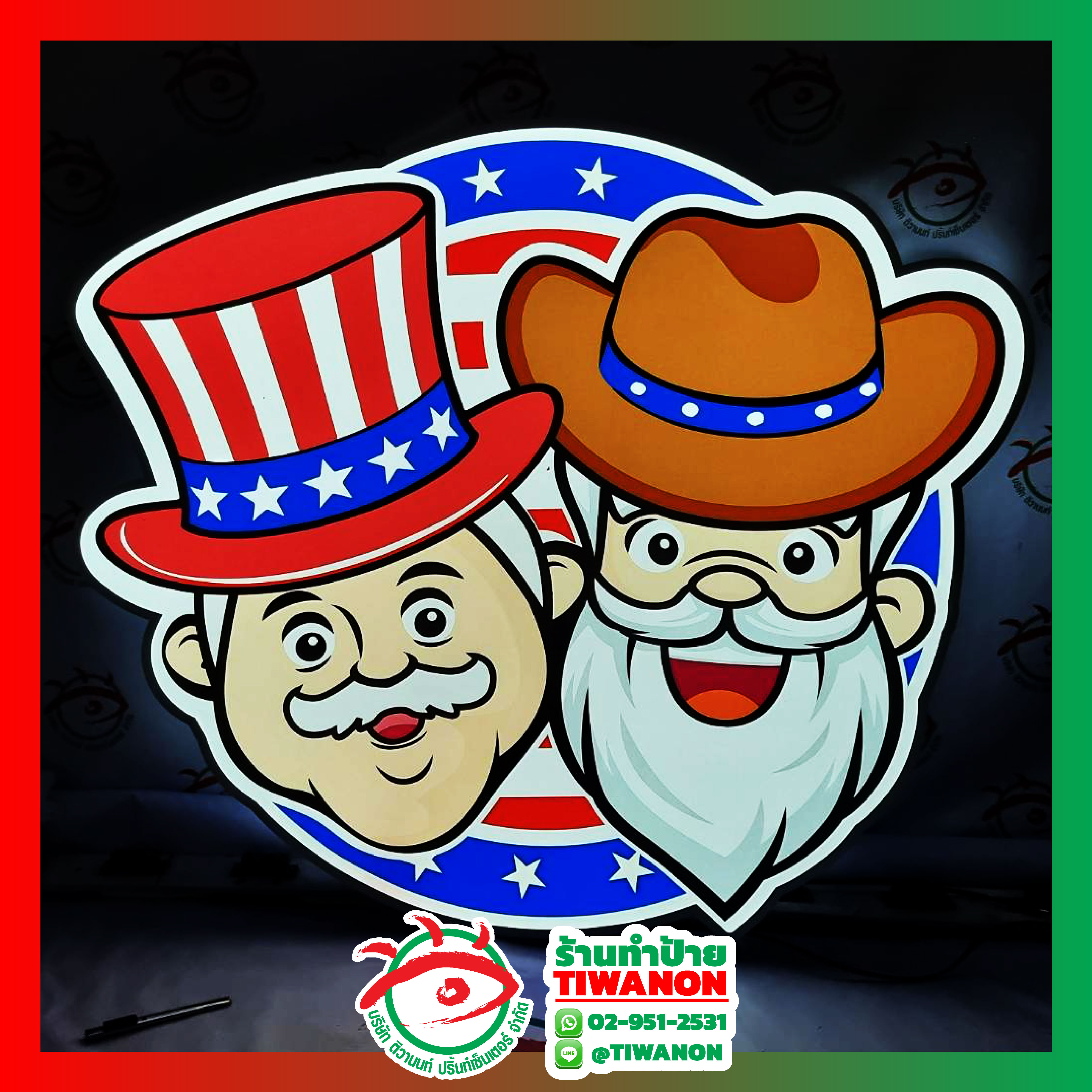 ป้ายที่ปรากฏในภาพเป็น ป้ายไฟโลโก้ซิงค์ไดคัท (Zinc Lightbox Die-cut) ที่ออกแบบในสไตล์ การ์ตูน (Cartoon Character Branding) เหมาะสำหรับใช้เป็นป้ายหน้าร้านหรือป้ายบอกตำแหน่งร้าน เพื่อสร้างความโดดเด่นและทำให้ลูกค้าจดจำแบรนด์ได้ง่ายขึ้น โดยผลงานนี้ผลิตโดย ร้านทำป้ายติวานนท์ ซึ่งขึ้นชื่อเรื่องงานไดคัทโลโก้ที่คมชัด แข็งแรง และให้แสงสว่างสวยงามทั่วทั้งป้าย