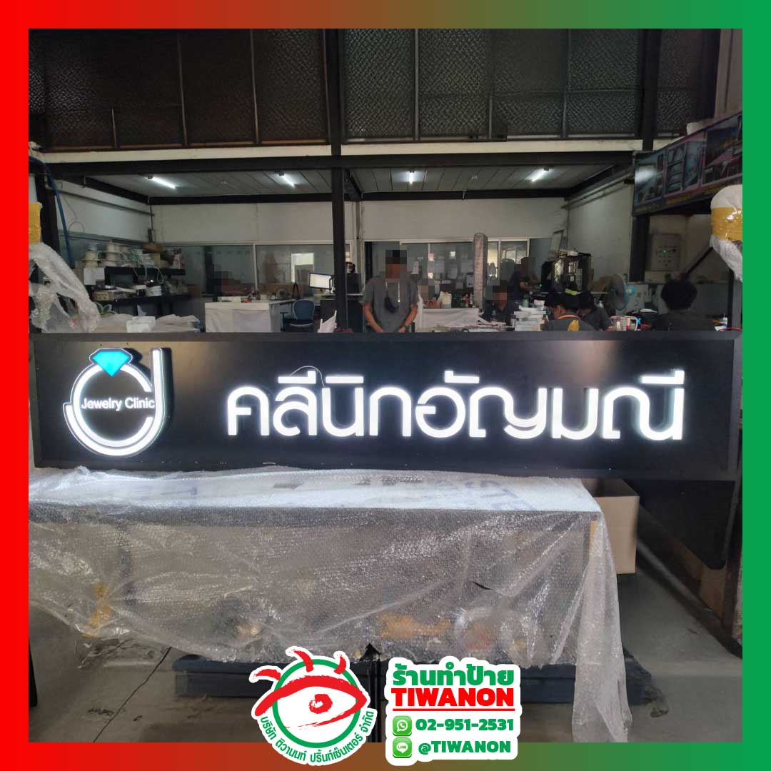 ป้ายในภาพเป็นผลงานที่ถูกผลิตและประกอบอย่างพิถีพิถันโดย ร้านทำป้ายติวานนท์ ซึ่งรู้จักกันในฐานะร้านป้ายคุณภาพสูงในจังหวัดนนทบุรี ป้ายชิ้นนี้ออกแบบมาเพื่อใช้เป็น ป้ายโปรโมท, ป้ายบอกตำแหน่งสถานที่ตั้ง, และ ป้ายโลโก้ไฟออกหน้า สำหรับธุรกิจชื่อ “คลินิกอัญมณี” (Jewelry Clinic) ที่ต้องการภาพลักษณ์ดูดี ทันสมัย และมีความน่าเชื่อถืออย่างยิ่ง