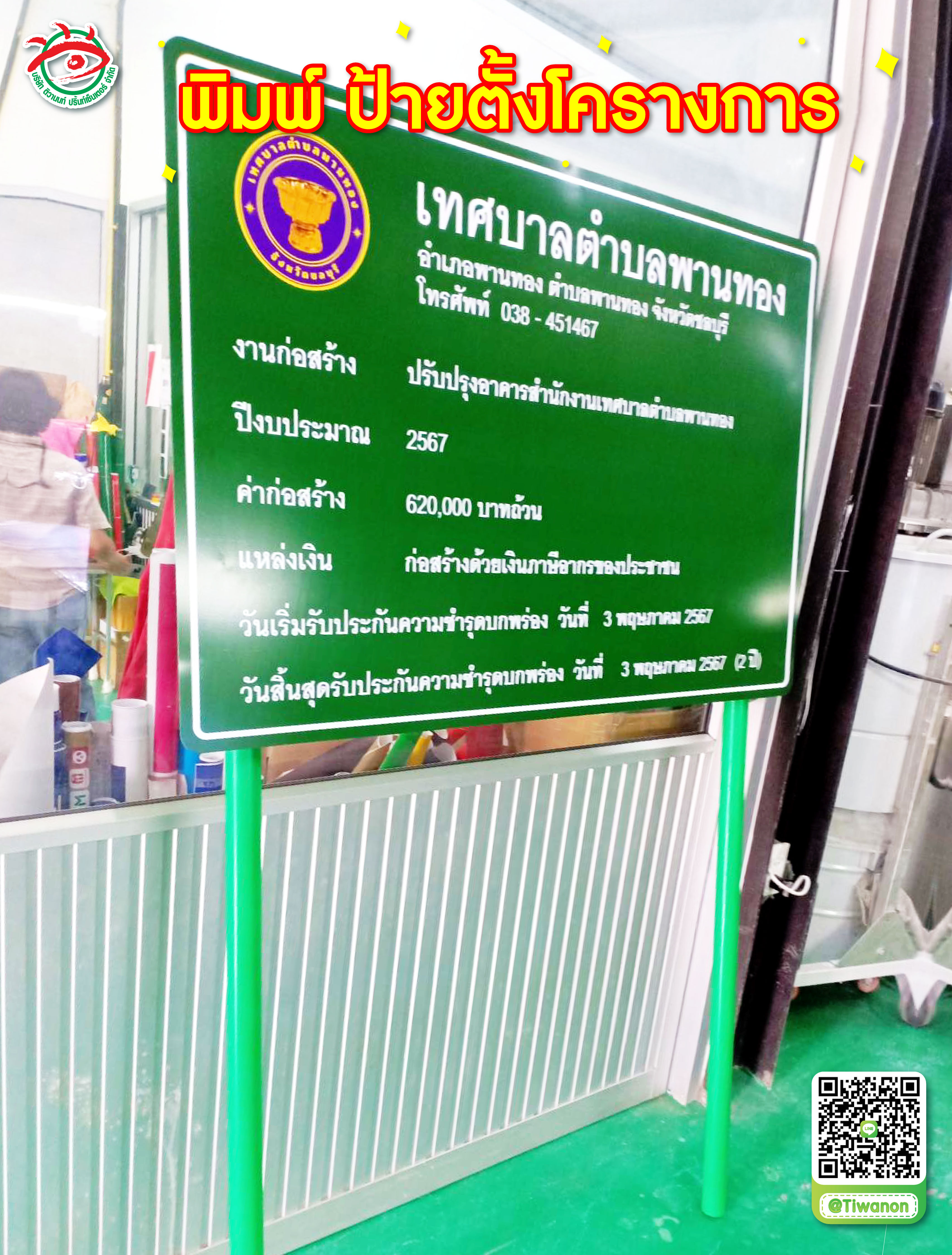 ป้ายโครงการก่อสร้างในรูปภาพนี้ถูกผลิตโดยร้านป้ายติวานนท์ เป็นป้ายสำหรับประชาสัมพันธ์โครงการของเทศบาลตำบลพานทอง เพื่อให้ผู้คนที่สัญจรผ่านไปมาได้ทราบถึงรายละเอียดของโครงการก่อสร้างต่างๆ ที่เกิดขึ้นในพื้นที่ โดยเฉพาะอย่างยิ่งข้อมูลเกี่ยวกับปีงบประมาณ ค่าใช้จ่าย และแหล่งเงินที่ใช้ในการก่อสร้าง