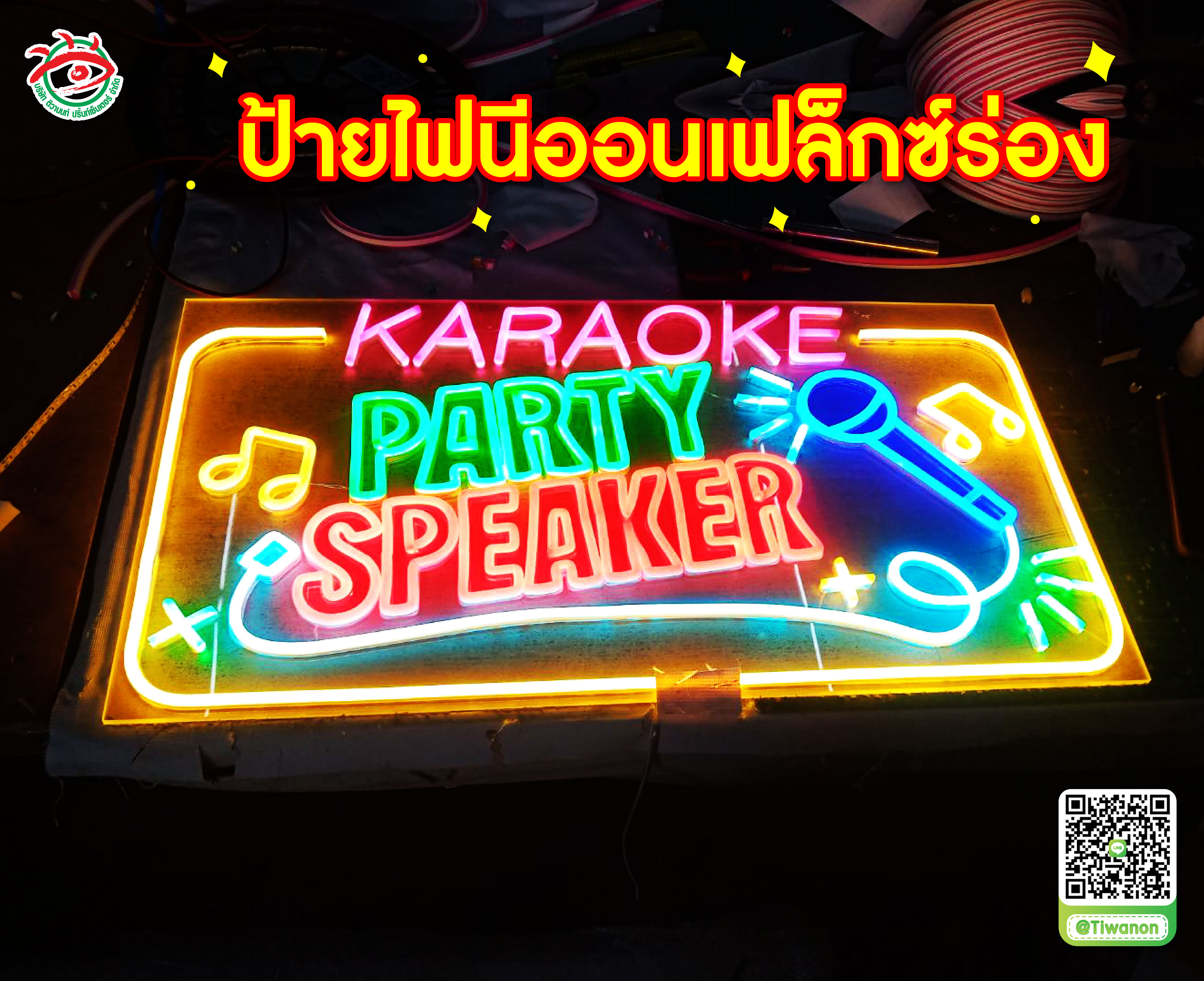 ป้ายไฟตกแต่งในภาพนี้เป็นป้ายที่เน้นความสดใสและน่าดึงดูด โดยใช้คำว่า “KARAOKE PARTY SPEAKER” เป็นข้อความหลัก ตัวอักษรสว่างไสวด้วยสีสันที่สดใสและดีไซน์ที่โดดเด่น ภาพนี้แสดงถึงป้ายไฟ LED ที่ผลิตจากนีออนเฟล็กซ์ เป็นการออกแบบที่ทันสมัย เหมาะสำหรับการตกแต่งภายในอาคาร ร้านอาหาร ร้านคาราโอเกะ ห้องนั่งเล่น หรือแม้กระทั่งห้องนอน ทำให้ทุกที่สามารถสร้างบรรยากาศที่สดใสและมีชีวิตชีวา