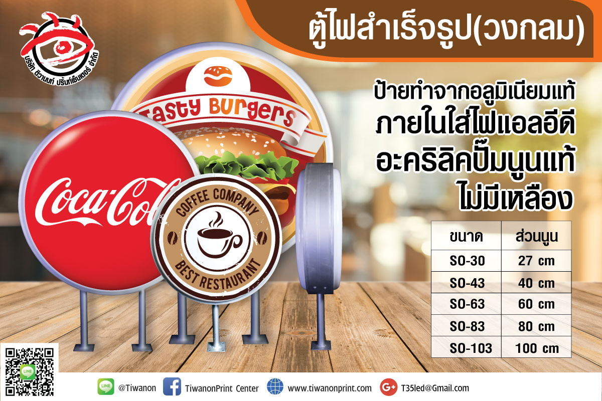 ป้ายตู้ไฟวงกลม หรือป้ายกล่องไฟวงกลม เหมาะสำหรับการใช้งานเป็นป้ายหน้าร้าน เพื่อให้ลูกค้าสามารถสังเกตเห็นได้ง่ายและดึงดูดความสนใจด้วยรูปทรงที่สวยงามและไม่เหมือนใคร โดยในภาพที่เห็นจะมีการใช้ป้ายจากแบรนด์ดังอย่าง Coca-Cola และ Tasty Burgers ซึ่งแสดงให้เห็นถึงคุณภาพของงานที่เราผลิตได้อย่างชัดเจน