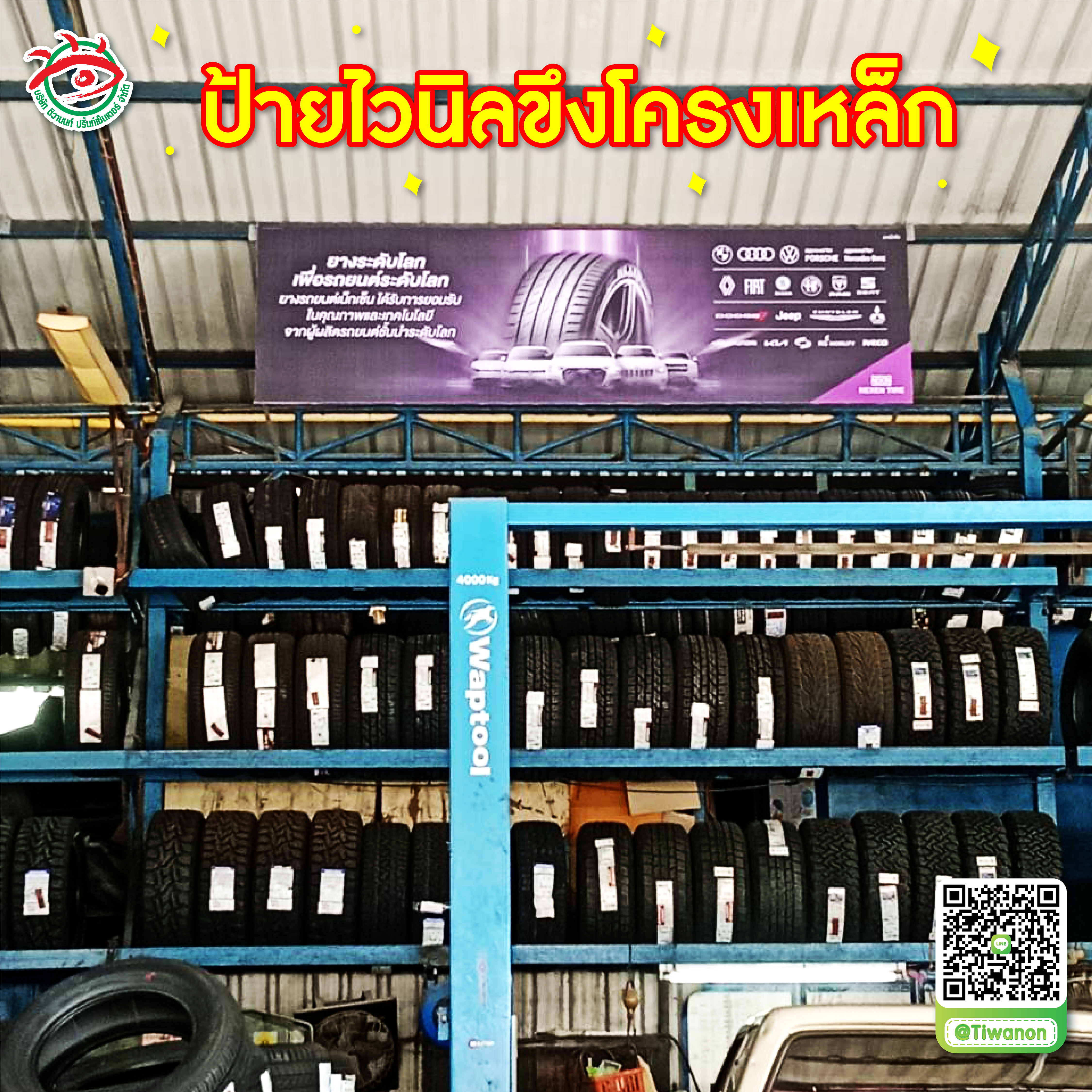 ป้ายในภาพนี้เป็น ป้ายโฆษณาไวนิลขึงโครงเหล็ก ซึ่งถูกติดตั้งไว้ในพื้นที่ภายในร้านจำหน่ายยางรถยนต์เพื่อประชาสัมพันธ์ยางแบรนด์ “NEXEN” ซึ่งเป็นยางคุณภาพระดับโลกที่ได้รับการยอมรับจากแบรนด์รถยนต์ชั้นนำมากมาย