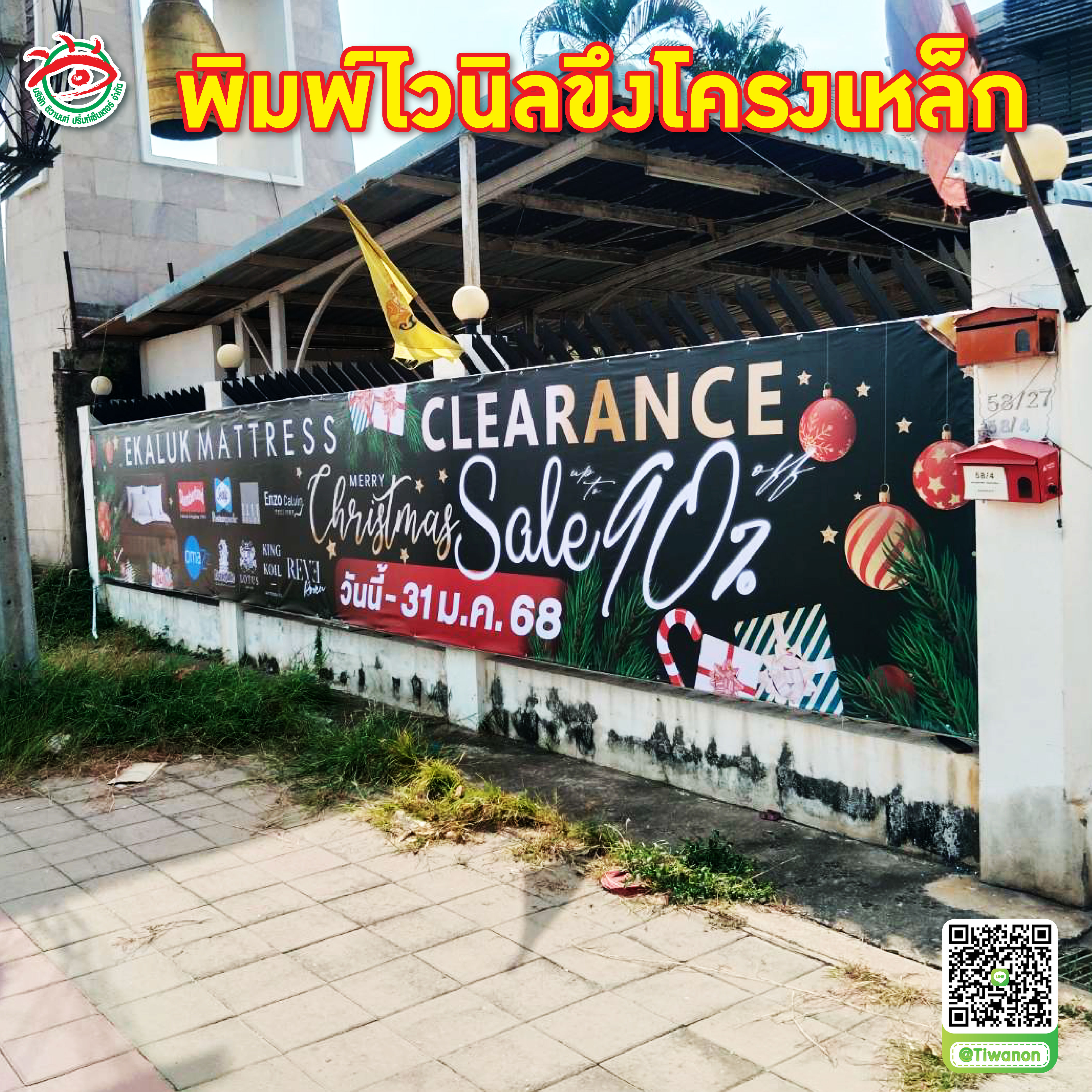 ป้ายพิมพ์ไวนิลขึงโครงเหล็ก เหมาะสำหรับการติดตั้งภายนอก เช่น หน้าร้าน ริมทางเดิน หรือพื้นที่เชิงพาณิชย์ ป้ายโปรโมชั่นเทศกาล ใช้สำหรับกระตุ้นยอดขายในช่วงเทศกาล เช่น คริสต์มาส