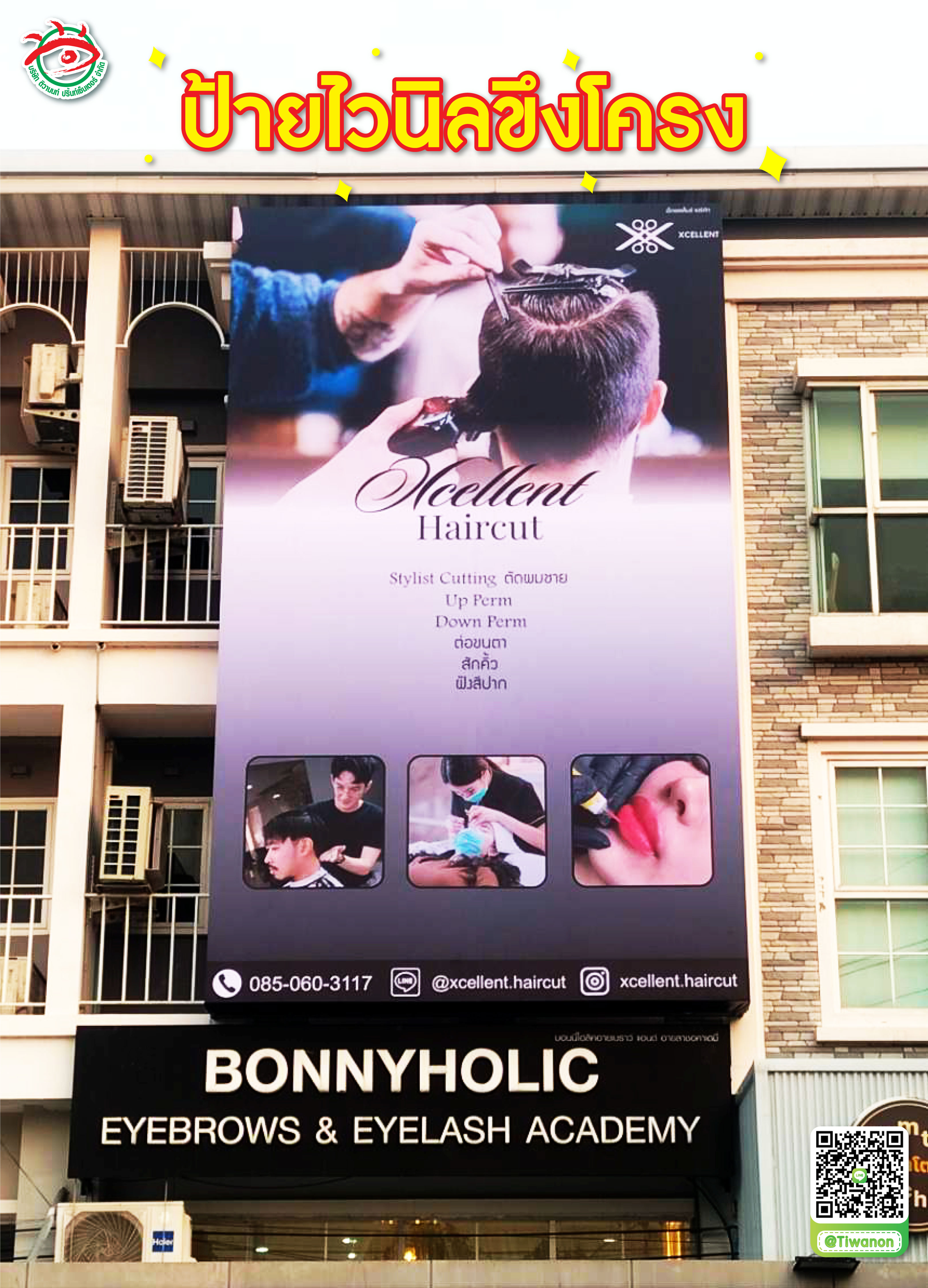 เพิ่มความโดดเด่นให้ธุรกิจคุณ ข้อความบนป้าย ป้ายร้านนี้ใช้การออกแบบที่เรียบหรู ทันสมัย ดึงดูดลูกค้าที่ต้องการใช้บริการตัดผมและเสริมความงาม โดยเนื้อหาบนป้ายประกอบไปด้วย ชื่อร้าน Xcellent Haircut บริการหลัก Stylist Cutting ตัดผมชาย Up Perm ดัดลอนยกโคน Down Perm ดัดปลายผม ตัดขอบตา บริการแต่งทรงคิ้ว สักคิ้ว บริการสักคิ้วเสริมโหงวเฮ้ง ฟิลลิปปาก บริการเสริมความสวยงามให้ริมฝีปาก ข้อมูลการติดต่อ เบอร์โทรศัพท์ 085-060-3117 Instagram @xcellent.haircut Facebook xcellent.haircut การออกแบบเน้นสีพื้นหลังโทนเทาดำให้ดูพรีเมียมและทันสมัย พร้อมรูปภาพของการให้บริการที่ช่วยให้ลูกค้าเข้าใจบริการของร้านมากขึ้น