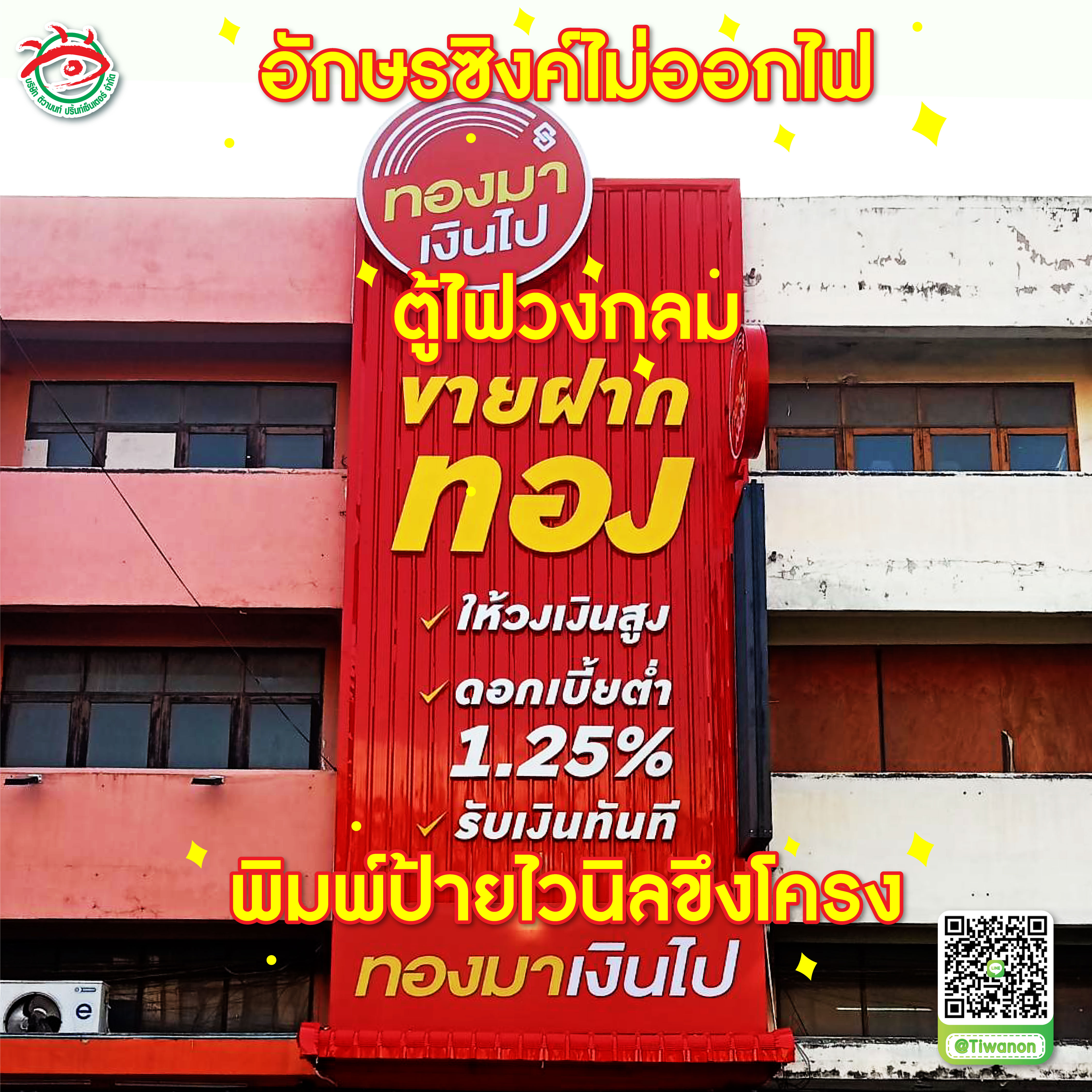 ป้ายนี้มีข้อความที่เน้นให้ลูกค้ารู้ถึงบริการที่ร้านนำเสนอ โดยใช้ฟอนต์ตัวหนาและขนาดใหญ่เพื่อความชัดเจน "ทองมาเงินไป" ชื่อร้านในโลโก้วงกลมด้านบนสุด "ขายฝากทอง" – ตัวอักษรสีเหลืองขนาดใหญ่เพื่อดึงดูดความสนใจ "ให้วงเงินสูง" / "ดอกเบี้ยต่ำ 1.25%" / "รับเงินทันที" – จุดขายหลักของร้านเพื่อให้ลูกค้าตัดสินใจง่ายขึ้น "ทองมาเงินไป" (ซ้ำที่แถบล่าง) – ตอกย้ำแบรนด์ให้จดจำได้ง่าย