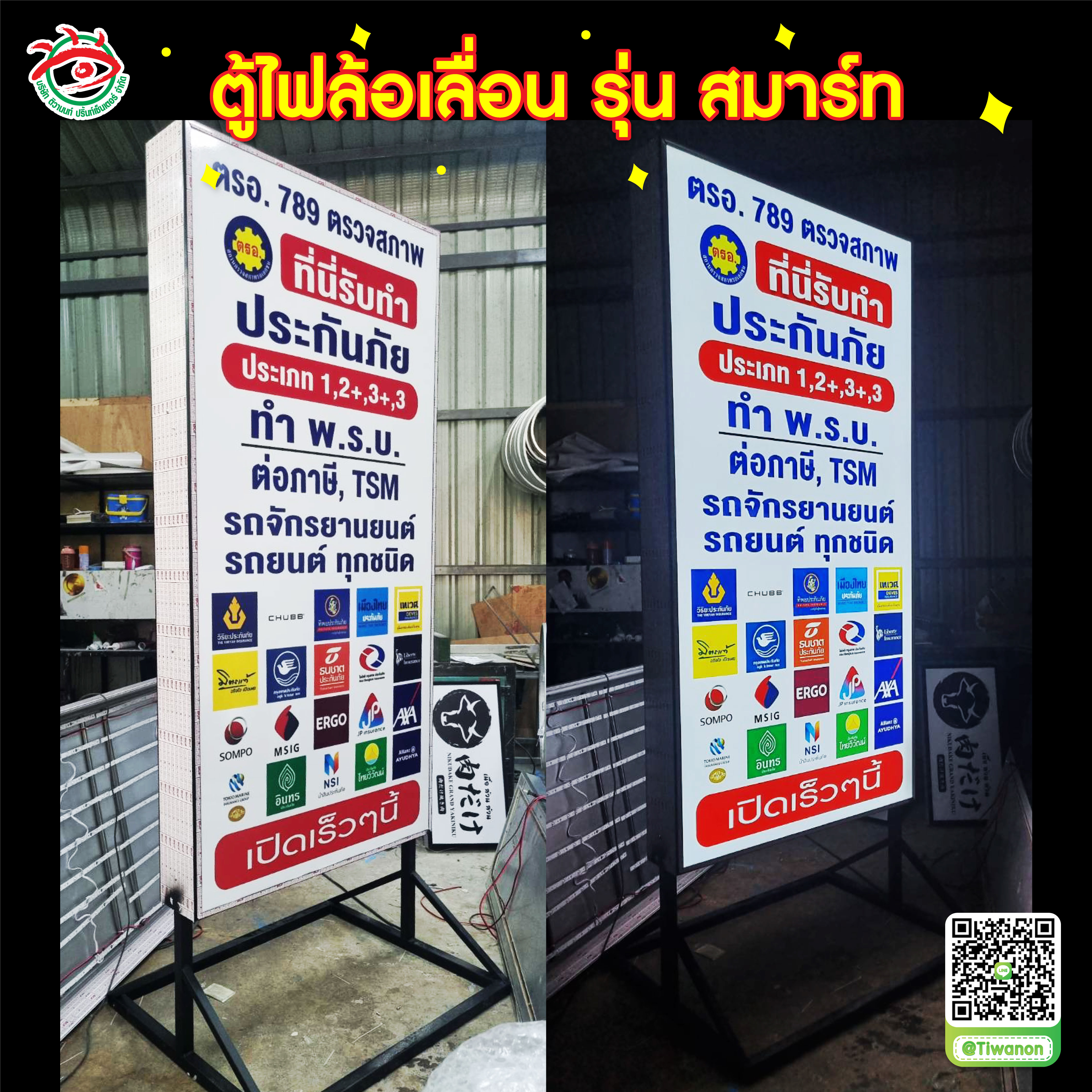ป้ายนี้จัดอยู่ในหมวด ตู้ไฟล้อเลื่อน (Mobile Lightbox) ซึ่งเป็น ตู้ไฟอลูมิเนียม รุ่นสมาร์ท Smart Model โครงสร้างแข็งแรง พ่นสีอบขาว พร้อมระบบล้อเลื่อนด้านล่าง ทำให้สามารถเคลื่อนย้ายได้สะดวก ใช้งานได้ทั้งภายในและภายนอกอาคาร เหมาะสำหรับตั้งหน้าร้าน สำนักงานตัวแทน หรืองานแสดงสินค้า นอกจากนี้ยังเป็นป้ายประเภท ตู้ไฟโชว์หน้าร้าน ที่ออกแบบมาเพื่อให้ข้อมูลสำคัญ เช่น บริการที่มี โลโก้บริษัทประกัน และข้อความชวนลูกค้าเห็นชัดเจนในทุกมุมมอง